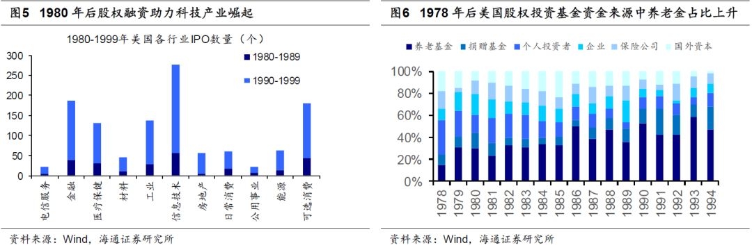 ①从股权融资发展看,美国当时采取投融资双向改革的办法:创新型企业通过IPO或者定增获得股票市场融资支持,1971年2月诞生的纳斯达克市场以其上市条件宽松、筹资成本低、市场交易活跃且效率高等特点,拓宽了创新型企业的上市渠道,培育了一大批高科技巨人,如微软、Intel、苹果、戴尔、亚马逊等等。纳斯达克市场对美国以电脑、信息为代表的高科技产业的发展起到了巨大的推动作用,美国高科技产业上市公司中绝大部分是在纳斯达克上市的。从IPO数量上来看,1980年至1999年,信息技术、金融、可选消费与工业行业中的企业IPO数量位列所有行业前四,分别为278、187、181与138家。