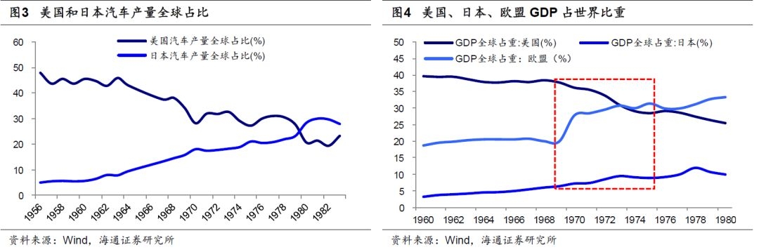 1970年代美国经济深陷滞胀泥潭,传统产业竞争力衰退。1973年中东石油输出国组织连续3次提高石油价格,发起“石油战”,国际石油价格从1973年1月每桶2.95美元飙升至1974年1月11.65美元,美国进口原油价格更是从1973年的4.08美元/桶上升至1981年的37.1美元/桶。能源价格的大幅飙升对美国经济造成了严重冲击,70年代美国经济进入低增速、高通胀的滞胀泥潭:1973年初到1975年初,美国CPI从3.6%持续攀升至11.8%,而GDP当季同比增速从1973Q1的7.6%降至1975Q1的-2.3%;1978年6月到1980年9月,美国CPI 由7.4%持续攀升至12.6%,而GDP当季同比增速从1978Q2的6.1%降至1980Q3的-1.6%。进入80年代,1981-82年美国再次出现经济衰退,工业生产总值从1979年的20263亿美元下降到1982年的19218亿美元,下降幅度达到5.2%,失业率高达10.8%,GDP当季同比增速从1981Q3的4.33%下降到1982Q3的-2.56%,CPI在1981年7-10月连续维持10%左右的高位,其中1981年9月更是达到11%。滞胀的经济环境使得美国传统制造业也遭受巨大冲击,钢铁和汽车作为美国二战后经济发展的两大支柱产业,在此期间均出现不同程度衰退。1960年美国钢铁业全球市场份额高达26%,到1980年已降至14.2%,汽车产业全球市场份额更是从1960年的48%大幅下降到了1980年的20.6%。汽车产业国际竞争力大幅下挫,进口汽车占美国国内汽车销售总量的比重从1960年的7.5%上升到1980年的26.5%,美国汽车产量从1973年的1200万辆下降到1980年的800万辆,而日本在1980年汽车产量达到1104万辆,超过美国成为世界头号汽车生产国。美国传统制造业衰落的背后是欧洲、日本经济实力日益上升,美国逐渐丧失了独霸世界市场的优势。1970年到1980年,美国GDP占全球比重从36.17%下降到了25.48%,同期日本GDP全球占比从7.16%上升到9.85%,其中1978年更是达到了11.83%,欧盟GDP全球占比从27%上升到33.26%。美国发展速度放慢,财政赤字加大,进出口贸易出现逆差,经济实力下滑。面对国内的困难局面和国际上的激烈竞争,美国政府决定,采取有效措施,发展科学技术,促进经济转型。