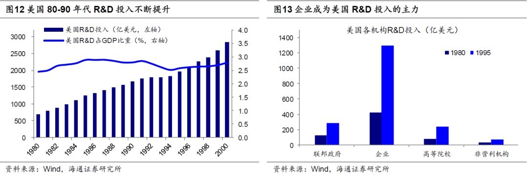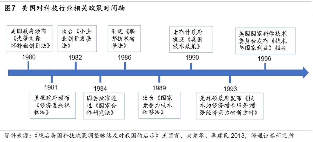 金融政策方面为培育新兴产业大力发展股权融资,同时美国养老金入市推动机构投资者占比提升。具体产业政策看,政策重心在80、90年代有所区别:20世纪80年代美国政府注重强化联邦技术向私人部门转移,并通过减税、放开企业间合作等政策鼓励中小企业参与技术创新,努力促使科研成果转化为经济效益。其中1980年美国政府颁布的《史蒂文森—怀特勒创新法》要求联 邦各部门、国家 实验室加强所持有技术向产业界的推介。1981年里根政府颁布的《经济复兴税收法》规定凡是企业当年研究开发支出超过前三年平均值的,其增加部分的25%可给予税收减免。