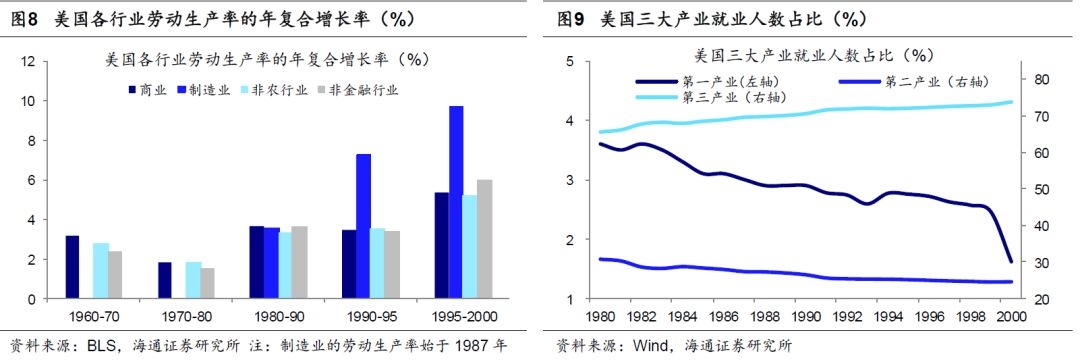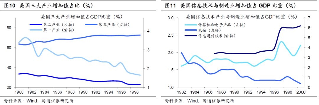 科技的崛起带来生产方式变革,各行业生产效率显著提高,尤其在1995年以后,各行业的劳动生产率增速明显加快,1990-1995年间,制造业劳动生产率的年均复合增长率为7.24%,非金融行业为3.37%,商业和非农行业分别为3.46%和3.47%,到了1995-2000年间,制造业上涨到9.7%,非金融行业达到 5.98%,商业和非农行业分别上涨到 5.36%和5.17%。生产效率的提升加快了资本与劳动力流动,促进产业结构优化升级。从就业看,美国第三产业的就业比重从1980年的65.6%上升到2000年的73.96%。而同期第一产业就业占比从3.6%下降到1.62%,第二产业就业占比从30.8%下降到24.42%。