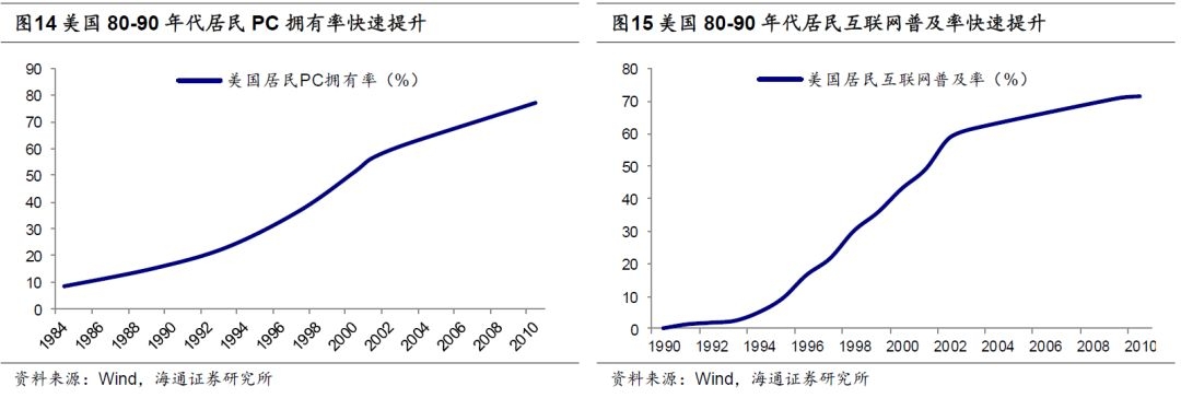 第一步,关键技术突破:PC硬件普及与互联网软件搭建。关键技术的突破往往成为科技周期及产业结构调整的触发因素:20世纪80年代开始,美国信息技术产业中半导体、路由器等硬件设备技术不断革新,PC出现使得计算机从企业、机构推广到个人使用者,计算机迅速普及,美国居民PC拥有率从1984年的8.2%攀升至1990年的21.7%,到2000年已达到51%。在计算机终端普及的基础上,互联网开始走进居民日常生活并快速发展,从1991年到2000年,美国居民互联网普及率从1.2%迅速攀升至43.1%。