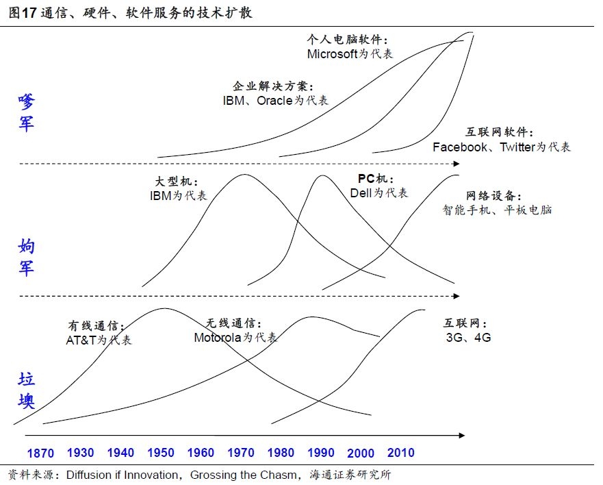 ②1990-1995年互联网快速发展带动网络端公司业绩股价向好。1984年思科以及其生产的多协议路由器的出现,使得Network变成Internet,同时,Intel在1989年推出的80486处理器和1993年推出的奔腾处理器,使得运行速度达到了工作站处理器的水平,叠加电脑终端的普及,推动1990-1995年互联网迅速普及。在1990-1995年期间半导体行业最大涨幅687%,通信246%,同期标普500110%,龙头公司思科最大涨幅6871%,Intel 959%,从业绩看,思科1990-1995净利润复合增速为101.1%,Intel为40.6%,同期标普50010.4%。③1996-2000年软件产业崛起,互联网公司领涨。以微软和甲骨文为代表,前者利用Windows 操作系统垄断了整个软件市场,使大多数软件都基于Windows开发,公司并陆续推出Excel和Word等系列软件,逐渐确立了软件行业的龙头地位。而以甲骨文为代表的纯软件公司的出现,象征着计算机产业链的进一步分工。在1996-2000期间,微软和甲骨文股价区间最大涨幅为1089%和810%,同期软件行业636%,标普500145%,而微软和甲骨文净利润复合增速在1996-2000年为52.3%和28.8%,同期软件行业70.8%,标普50010.7%。
