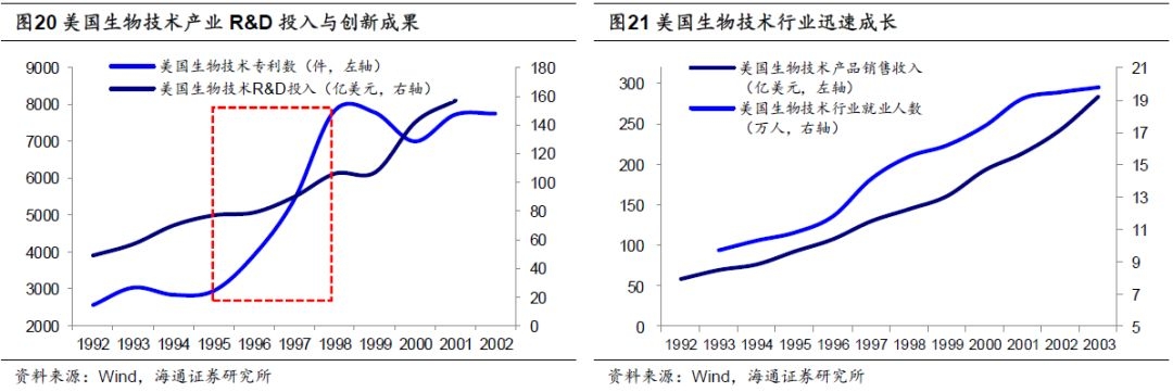 ③依托于科技研发投入,美国成为生物技术行业的领跑者,1992-2002年,美国生物技术产业R&D投入从49亿美元增长到157亿美元,年均增速达到31.8%。从1998年以来,美国每年生物技术专利数都超过7000件,生物技术专利占美国全部专利比重由1992年的4.3%上升到2002年的8%。技术的不断进步,使该行业规模迅速扩大,1993-2000年,美国生物技术产品销售额从70亿美元增长到193亿美元,从业人数从9.7万人增长到17.9万人。总结这一演进规律,20世纪80-90年代以计算机、互联网为关键突破,以信息技术为核心搭建的新兴产业成为后来美国科技强大的基石,2010年美国信息通信技术产业增加值达到9374亿美元,占GDP的比重为6.3%。生物技术方面,截至2008年美国拥有世界上约50%的生物技术公司和生物技术专利,美国生物技术产品销售额占全球市场的90%以上,高新技术产业逐渐成为美国经济发展的支柱。