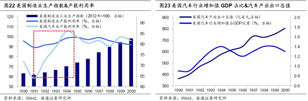 从1970年到2000年,美国农业就业人数从339万人下降到246万人,而主要农作物单位产量却不断上升,玉米单位产量从72.4蒲式耳/英亩上升到136.9蒲式耳/英亩,小麦单位产量从31蒲式耳/英亩上升到42蒲式耳/英亩,大豆从26.7蒲式耳/英亩上升到38.1蒲式耳/英亩。美国每一个农业劳动力可以养活的人数从1960年的25.8人增长到1989年的98.8人。制造业方面,通过全面的技术改造,包括采用新技术,实现生产自动化和电脑化,改革管理流程和工艺流程,提高了生产效率,美国制造业的工业生产指数从1980年的48.91上升至2000年的98.2(以2012年为100),产能利用率从1993年到2000年一直维持80%以上。这其中以美国汽车产业为例,生产领域通过使用计算机的快速设计和试验系统开发出先进的制造工艺,对控制系统和内燃机进行更新,生产效率大幅提升。销售运营方面运用互联网进行经营、开展网上订货、与客户进行直接沟通,加强了其国际竞争力。汽车行业产能利用率从1991年的64.1%上升到2000年的81.71%,行业增加值占GDP比重从1990年的0.9%上升到2000年的1.3%,其中1994年达到1.4%。1991年到2000年,汽车产业出口总值从398.9亿美元增长到803.6亿美元,涨幅达到101.4%。尤其在1994年,美国汽车业无论在总产量还是总收入都超过了日本,重新夺回世界汽车业龙头位置。