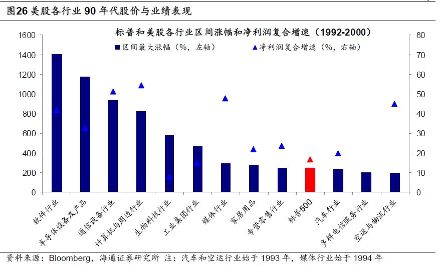 从行业层面看(由于数据样本的缺失,统计1992-2000年的数据),1992-2000期间美股行业指数涨幅前三的均是科技板块:软件行业区间最大涨幅为1403%、半导体设备及产品行业1172%、通信设备行业940%,标普500 242%,科技股长牛的背后是科技类公司业绩持续向好,1992-2000年间软件行业净利润区间复合增速41.9%,半导体行业33%,通信设备行业51.4%,同期标普50016.7%。