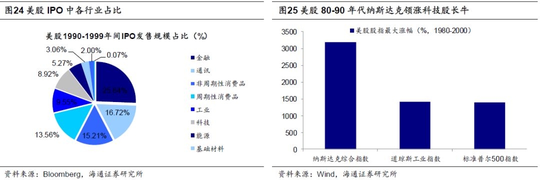我们前文提到1980-90年代一个重要的政策红利是美国进行资本市场改革,大力发展直接融资,支持科技企业上市。这一轮科技浪潮催生了大量高科技企业,在1980-1999年间,美国产业结构向先进制造和高端消费转移,信息技术、金融、可选消费与工业行业中的企业IPO数量居前,分别为278、187、181、138家,IPO总的发售规模达9795.4亿美元,科技企业发售规模达873.3亿美元,占比8.9%。科技企业大量上市叠加行业需求带动业绩持续上行,80-90年代美股掀起以纳斯达克为代表的科技股长牛行情,尤其进入90年代下半程出现了从美股到全球的科网泡沫。