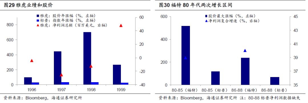 微软:90年代制定行业标准,形成行业垄断。微软的崛起是在90年代计算机已普及且互联网开始加速发展的阶段。1990年微软发布Windows 3.0,真正实现人机交互,并直接应用于电脑厂商的个人电脑,推动操作系统的普及化,在1990-1992年期间,公司净利润的复合增速为59.3%,标普500 0.8%,股价区间最大涨幅395%,同期标普500 49%。1993年,微软推出Excel等系列软件,并最终击败该领域的莲花公司,1995年Word 95 和IE浏览器的出现,使微软在该领域超越了文字编辑器软件巨头Wordperfect,并逐渐垄断软件市场,公司业绩加速上行,在1993-1999年期间,微软净利润复合增速为41.8%,标普500 17.5%,股价区间最大涨幅2583%,同期标普500 242 %。到1999年底,微软市值6010.3亿美元,排名美股第1。