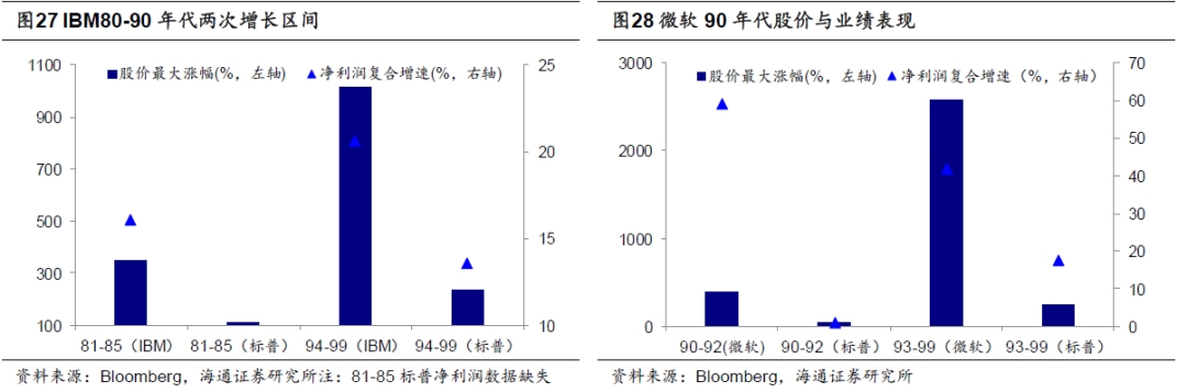①1980-1990年以电脑为代表的硬件端普及带动硬件设备类公司率先领涨。1981年IBM推出PC,导致个人电脑生产由一体化转向硬件、软件以及技术服务的分工明细化,推动个人电脑生产规模化,叠加Intel在半导体上的突破,硬件行业取得快速发展。而以IBM为代表的硬件生产企业是这波科技浪潮的领跑者,1980-1990年IBM股价区间最大涨幅1932%,同期纳斯达克291%,IBM1980-1990年净利润复合增速为5.4%,年均增速8.6%。