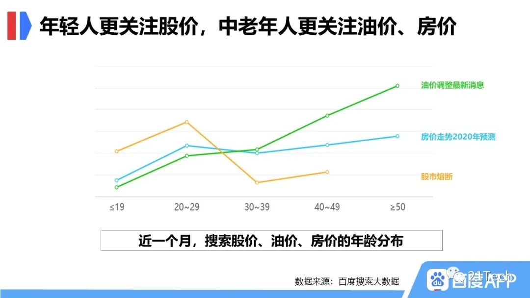 从人群分布而言,30岁以下的“小鲜肉”更关注股价相关的消息,而30岁以上的人群对油价、房价的关注度更高。