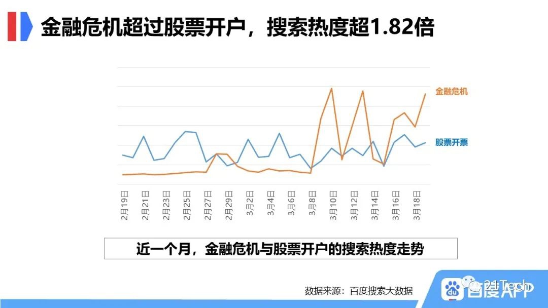 对于中国股民乃至“吃瓜群众”而言,金融市场的变动也极度牵引着情绪。百度大数据显示,“股票开户”的搜索热度环比上涨142%,“金融危机”的搜索热度更是大幅提升,近一个月环比上涨258%,领先“股票开户”1.82倍。