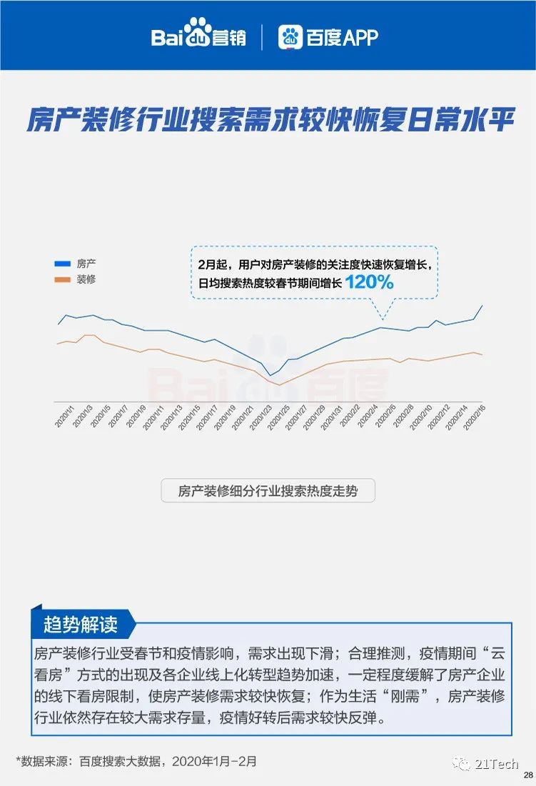 不过,从搜索量来说,房产依然保有较高的热度,对行业而言这应该不是一件坏事。百度相关数据同时显示,房产装修行业也在疫情好转后实现较快反弹,2月起,用户对房产装修的关注度快速恢复增长,日均搜索热度比春节期间增长120%,逐步接近往年同期水平。
