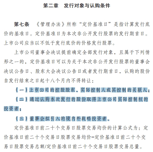 再复习下再融资新规(正式名称为《上市公司非公开发行股票实施细则》)第七条可以发现,向潜在控股股东发行股份,可以适用锁价定增,还可以绕开有关“战略投资者”的严苛认证,确定性很强。