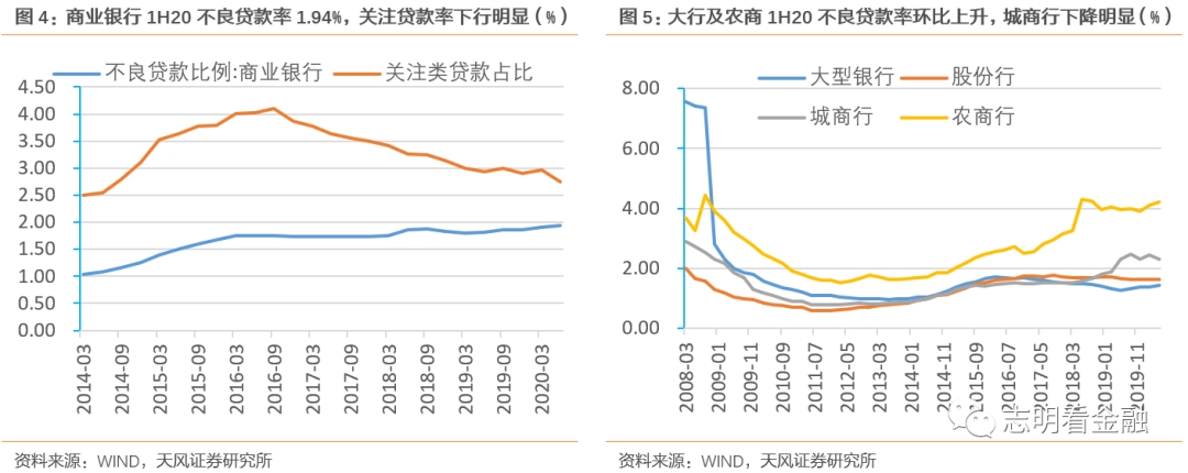 资产质量平稳。20Q2商业银行不良贷款余额2.74万亿元,环比增加1243亿元;不良贷款率1.94%,环比+3BP;关注贷款率2.75%,环比-22BP。疫情冲击之下,银行加大不良核销,资产质量指标保持平稳。20Q2大行不良贷款率1.45%,环比上升6BP,不良充分暴露;股份行不良贷款率1.63%,环比下降1BP;城商行2.30%,环比下降15BP,或与个别银行风险处置有关。