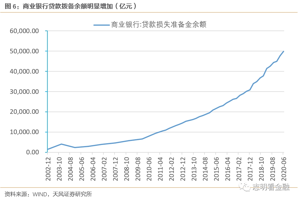20Q2商业银行拨贷比3.54%,环比上升4BP;贷款拨备余额5.0万亿元,环比增加2060亿元,为应对资产质量恶化,银行加大了拨备计提。