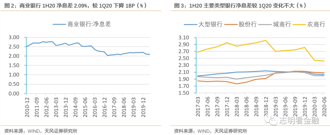息差平稳。1H20商业银行净息差2.09%,较1Q20下降1BP,相对平稳。大行/股份行/城商行/农商行1H20净息差为2.04%/2.09%/2.00%/2.42%,季环比-1/-1/0/-2BP。考虑到息差的滞后性及存量浮动利率贷款定价基准转换至LPR等影响,我们预计未来一年息差下降压力仍存。