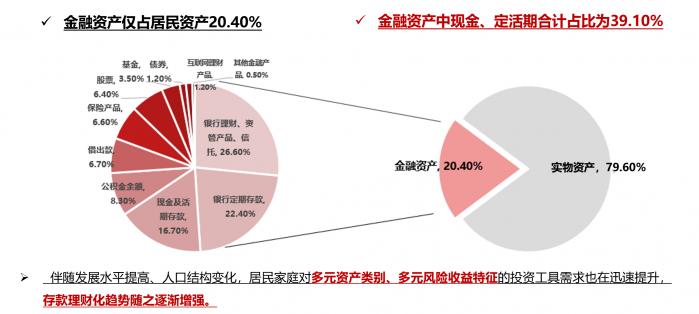 这些资金到哪里去?目前,整个金融资产在居民资产中的占比,仅占了20.40%;其中,现金、定活期存款占比合计39.10%。现在随着发展水平的提高,和对国外资产管理行业趋势的分析,随着人口结构的变化,居民对于多元的资产类型,需求是迅速提升的,对存款理财的需求是减弱的。所以要看我们能否有投资方案,把定期活期的钱转移到资管里来。