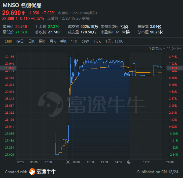 $名创优品(MNSO.US)$收盘涨幅7.03%,报29.67美元。截至发稿,名创优品盘后涨0.37%,报29.8美元。