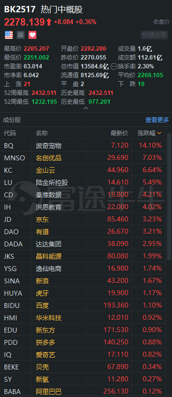 热门中概股周一收盘涨跌各异。其中21只股票上涨,19只股票下跌,2只股票收平。