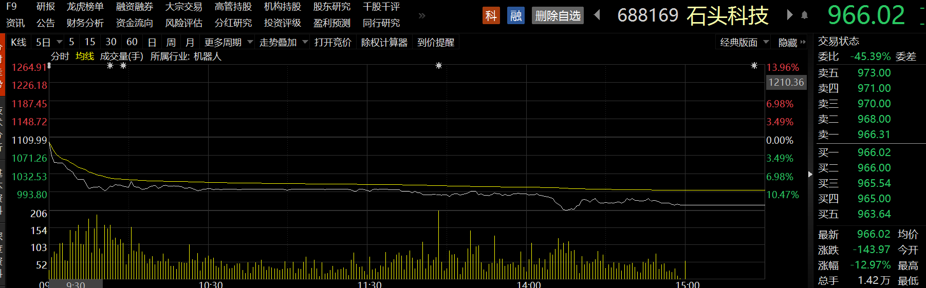 2月22日,石头科技低开,开盘价为1099.97元/股,开盘后公司股价急剧下跌,盘中跌幅最高至13.96%。截至收盘,石头科技收报966.02元/股,跌幅为12.97%,创公司科创板上市以来最大的跌幅。2月23日,石头科技股价继续走低,股价以840元/股开盘,截至发稿,仍处于下跌趋势。
