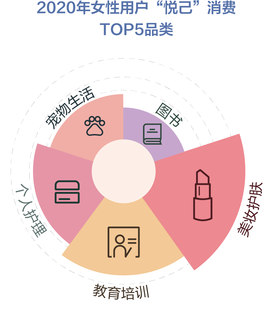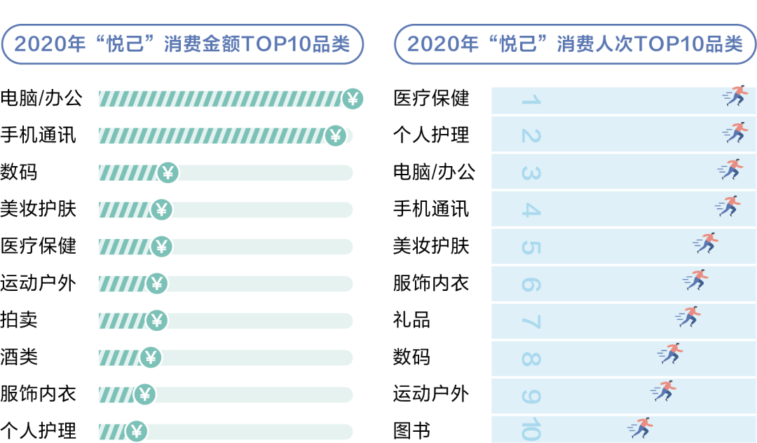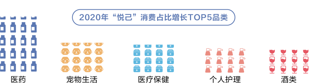 2020年,受疫情的影响,医药和医疗保健消费占比大幅增长,此外,宠物生活、个人护理和酒类等“悦己”消费的占比也快速提升。