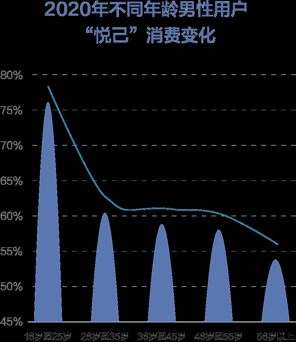 男性用户“悦己”消费占比在每个年龄阶段都远高于女性,男性更愿意宠爱自己。