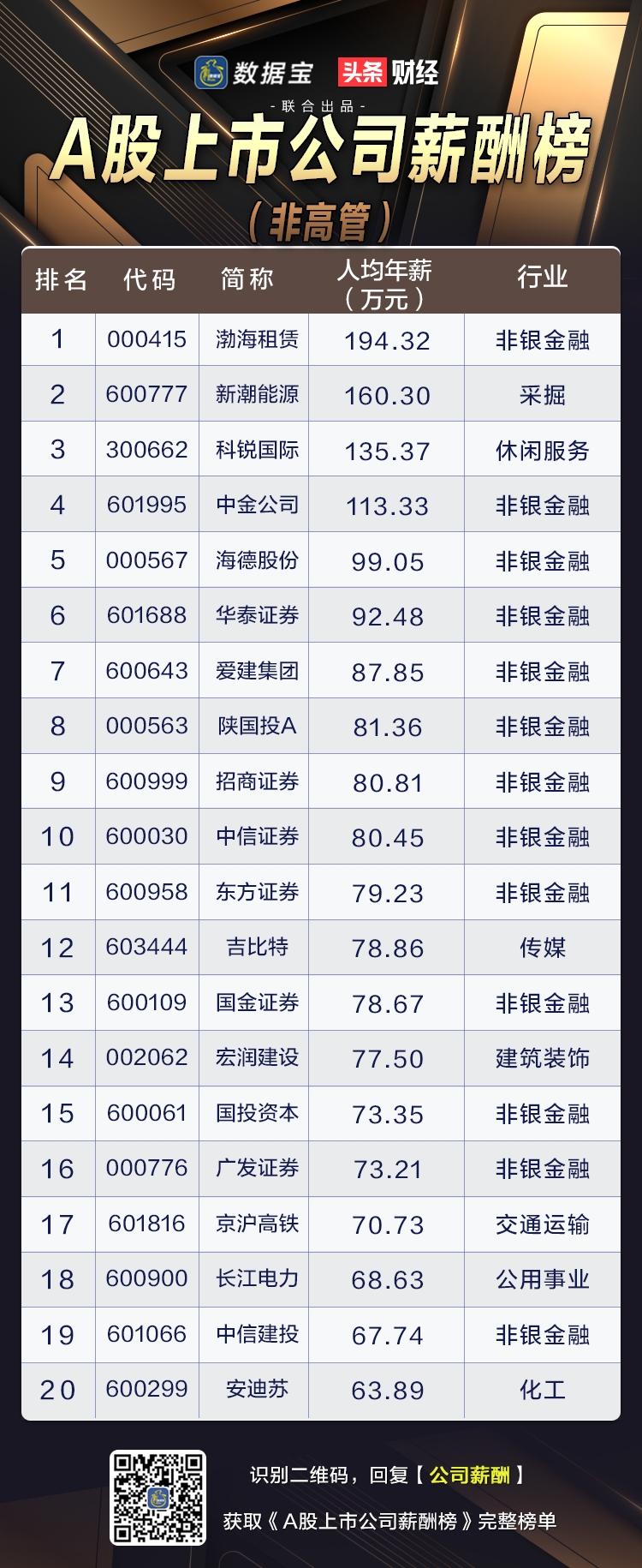 证券时报·数据宝《A股上市公司薪酬榜》统计, 4家上市公司人均薪酬超过百万,分别是渤海租赁、新潮能源、科锐国际、中金公司。渤海租赁蝉联榜首,2020年人均薪酬为194.32万元,连续两年保持人均190万元以上的高薪,相当于每个员工都能享受到其他上市公司高管待遇。按照250个工作日计算,渤海租赁日薪平均超过7500元,两个工作日获得薪酬高于其他公司人均月薪。新潮能源为第二名,2020年人均薪酬为160.3万元。
