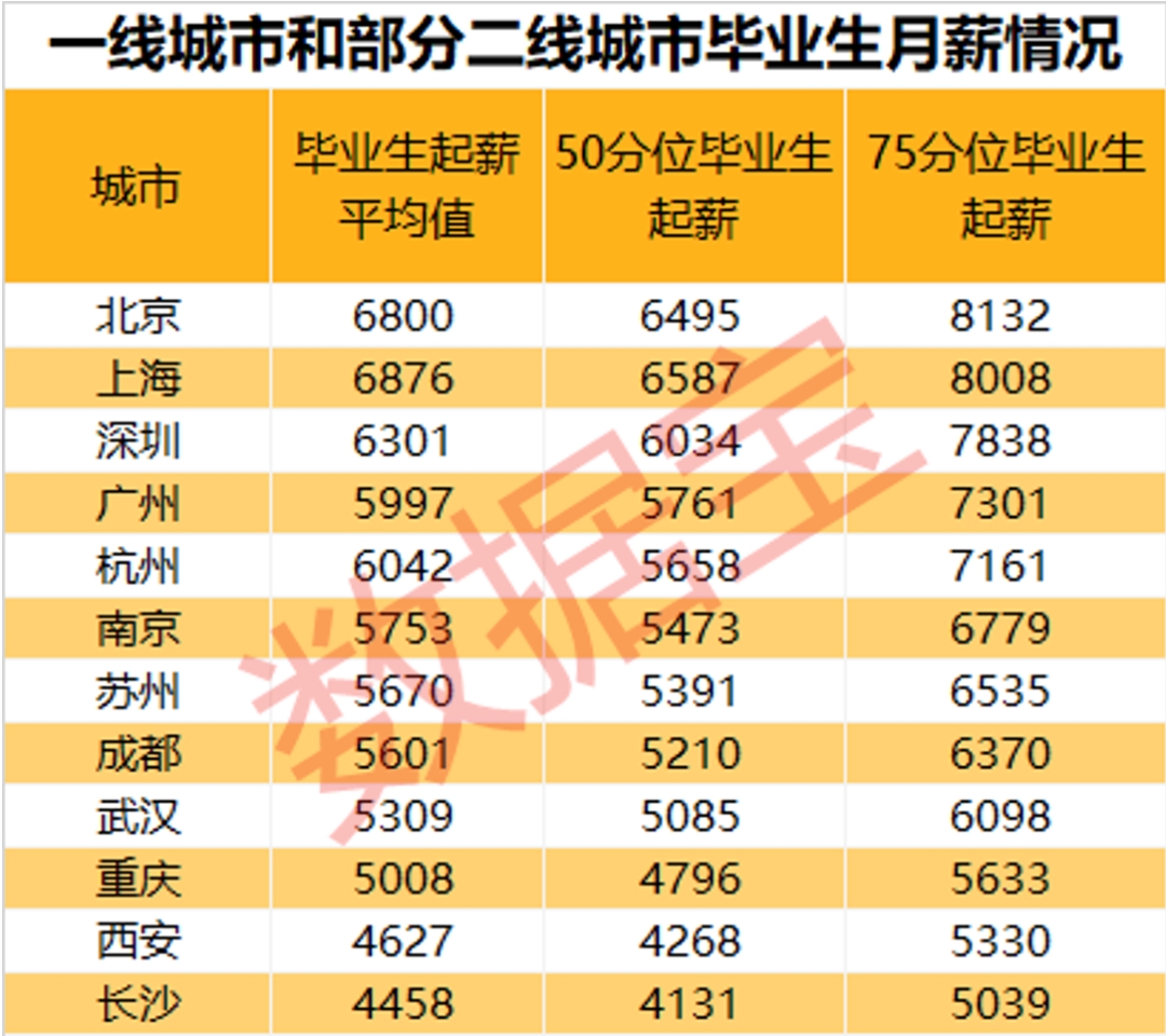 “新一线“城市毕业生起薪也逐渐逼近一线城市,根据前程无忧网发布的统计,2020年北上广深毕业生起薪在6000-7000之间,杭州、南京、苏州、成都等”新一线“城市毕业生起薪在5000-6000元之间,其中杭州毕业生起薪平均值已高于广州。考虑到房租、消费等因素,一线城市毕业生起薪并不高。