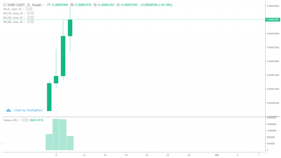 过去短短两三个月,SHIB(俗称SHIB)的涨幅已经超万倍,继狗狗币后再成“传奇”。5月11日,在大多数数字货币走跌的行情下,SHIB价格依然坚挺,最高涨超30%。截止5月11日18:30,SHIB在火币全球站的报价为0.00003454USDT(尾数价为3454)。