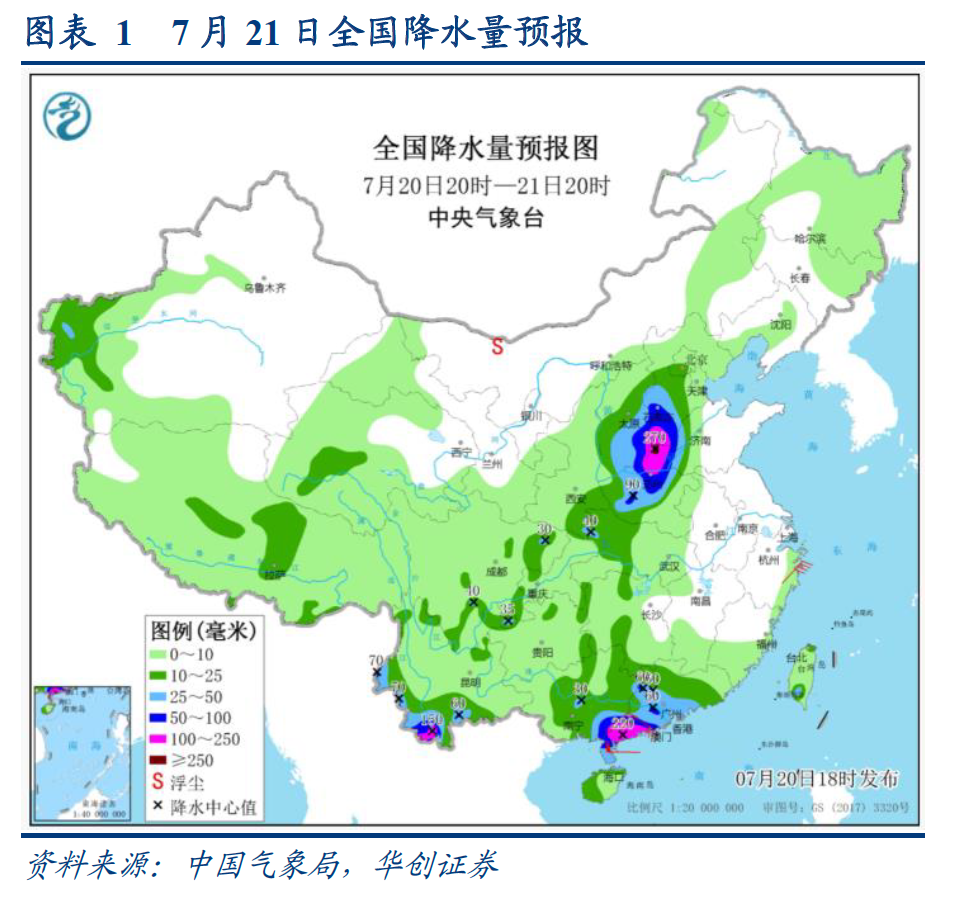 对比去年7月的南方汛情,此次汛情的特征在于降雨在时间和空间上高度集中:目前汛情主要集中在河南省,全省共有31座大中型水库超汛限水位。郑州为灾情中心,小时降水、单日降水均已突破自1951年郑州建站以来60年历史记录,17日-20日下了以往郑州一年的量。嵩山、偃师、新密、伊川、登封等5个站点突破建站以来日降水量历史极值。