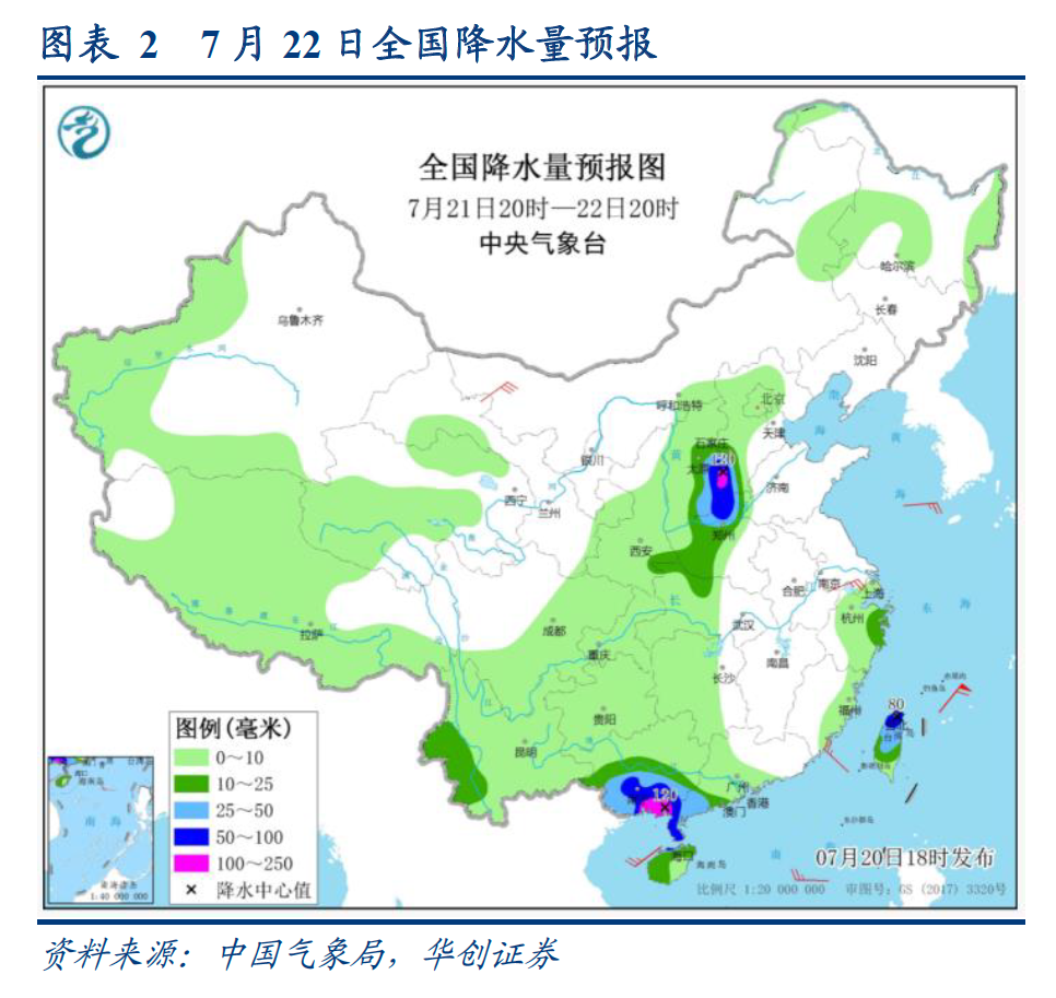 2、蔬菜价格,7月价格小幅上涨。河南同时也是我国的蔬菜种植大省,年蔬菜产量占全国约10%。郑州蔬菜产量占全国0.3%(寿光占0.5%)。汛情可能导致短期内蔬菜价格上涨,但由于蔬菜种植周期短,预计灾情对价格只能推动一时,持续时间不长。