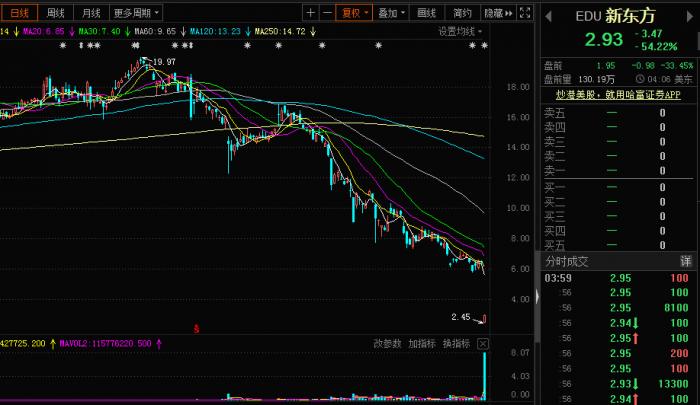 新东方上周五当日跌幅超50%,5个月的时间,股价从近20美元跌到了不足3美元。