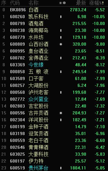 对于白酒来讲,今天同样是非常惨淡的一天,白酒板块指数暴跌5.52%,水井坊等多家个股跌停。而龙头酒企当中,泸州老窖、五粮液跌幅接近8个点,贵州茅台跌幅超5%,并且是跌破了年线。白酒在A股指数权重较高,拖累了指数。