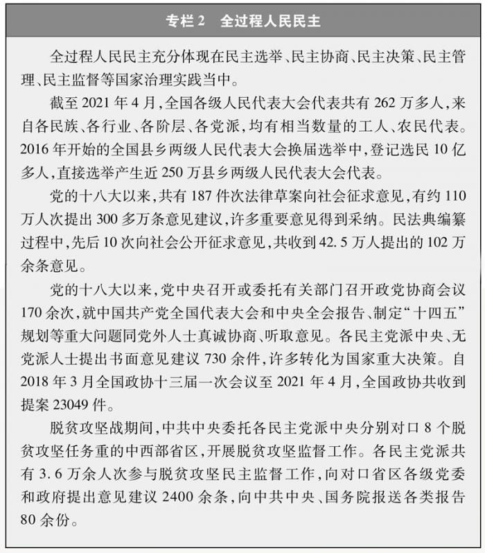 发展全过程人民民主。人民民主的真谛是有事好商量、众人的事情由众人商量,找到全社会意愿和要求的最大公约数。在长期探索实践中,党领导人民发展全过程人民民主,人民依法享有广泛权利和自由,通过多种渠道和途径行使民主权利,不只体现在几年一次的投票选举上,还体现在关系国计民生的重大公共事务决策上;不只体现在民主选举环节,还体现在民主协商、民主决策、民主管理、民主监督等国家治理其他环节;不只体现在政治领域,还广泛深入到经济、文化、社会等领域,成为人们日常工作和生产生活的组成部分。在中国,人民享有广泛充分、真实具体、有效管用的民主,人民的民主生活丰富多彩。如今的中国,早已远离了禁锢和封闭,民主蔚然成风,人们心情舒畅,社会充满活力。