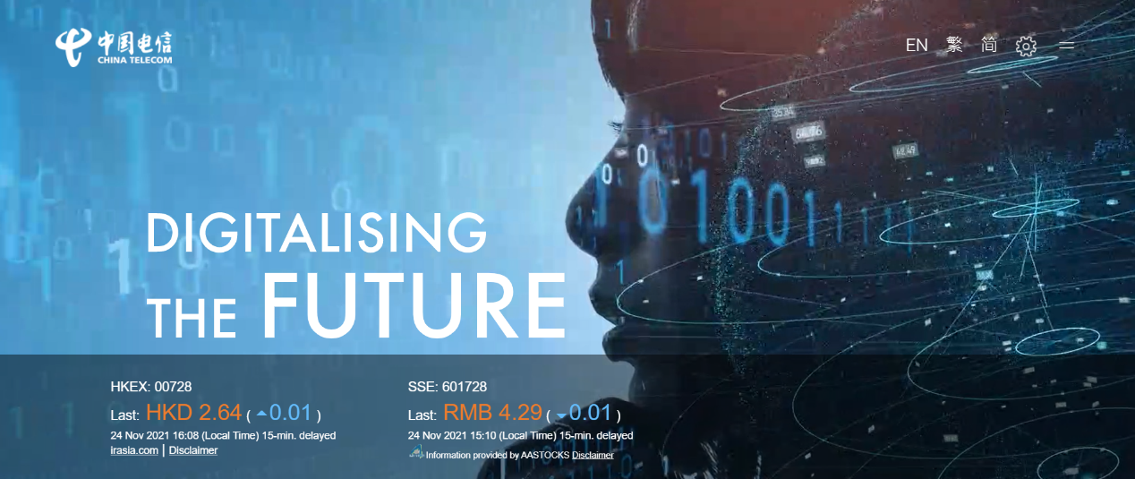 中国电信股份有限公司是一家全球大型的领先的全业务综合智能信息服务运营商,主要在中国提供固定及移动通信服务、互联网接入服务、信息服务,以及其他增值电信服务。于2020年底,本公司拥有约3.51亿移动用户、约1.59亿有线宽带用户及约1.08亿固定电话用户。本公司发行的H股及A股分别在香港联合交易所有限公司和上海证券交易所主板挂牌上市。