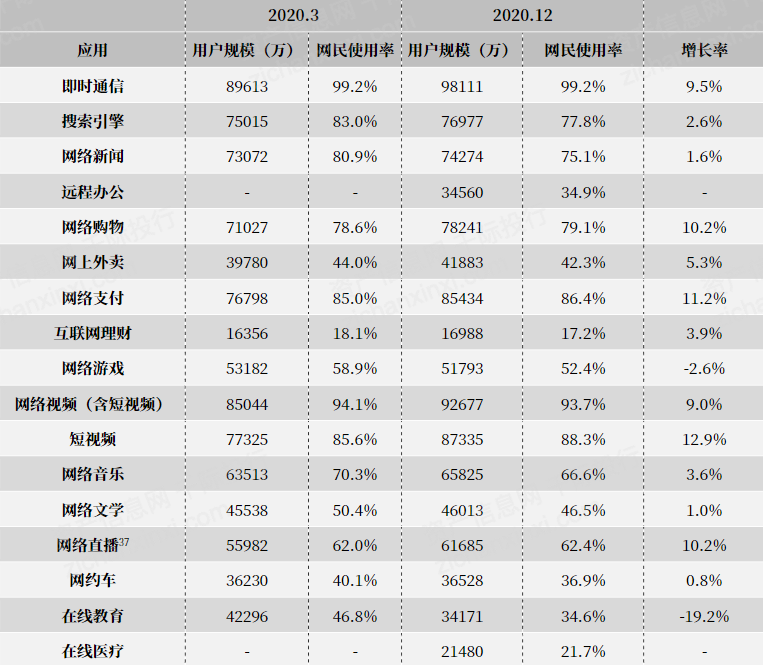 表 2020.03-2020.12网民各类互联网应用用户规模和使用率