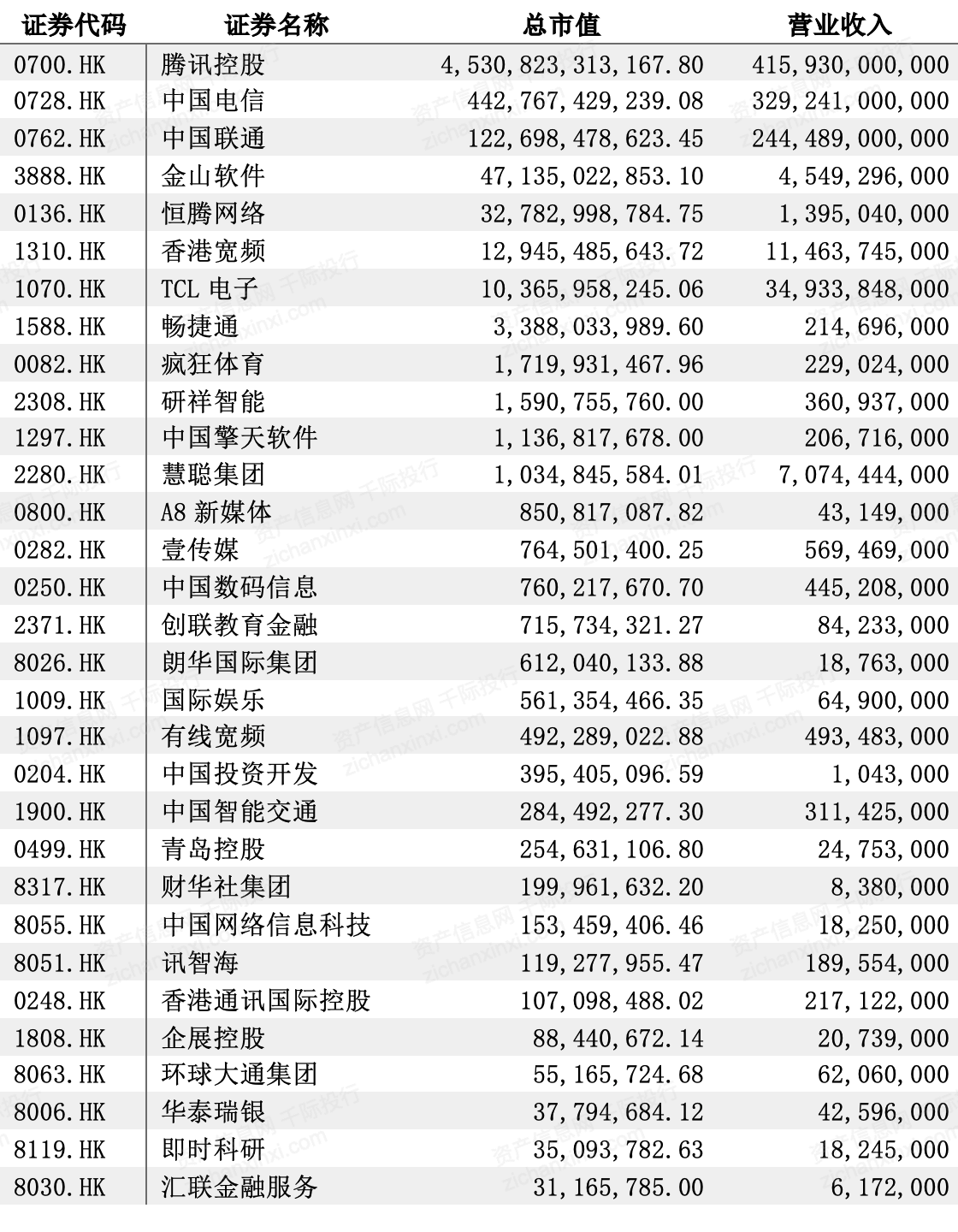 iFinD互联网+[HK]指数共有31家上市公司,按照总市值从高到低排序,可以得到如下表所示的排名。