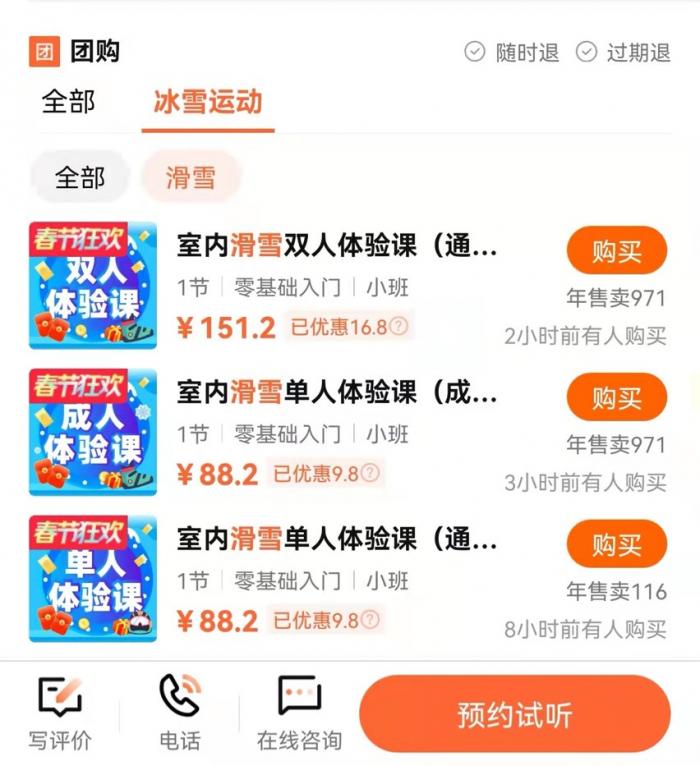 ▲某滑雪商户在大众点评上推出零基础入门滑雪体验课,销量火爆