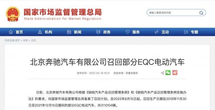 召回计划显示,自2022年8月15日起,北京奔驰召回生产日期在2018年11月30日至2021年12月15日期间的部分EQC电动汽车,共计10104辆。