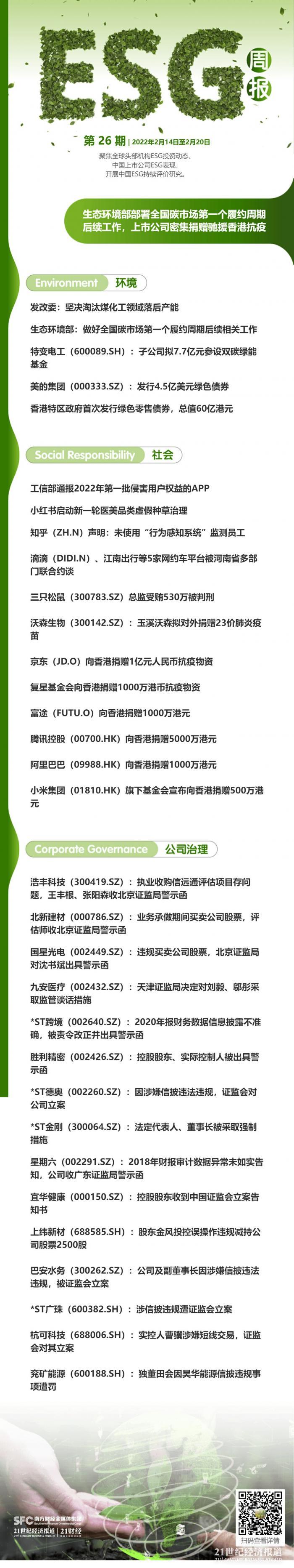 2月17日,生态环境部发布关于做好全国碳市场第一个履约周期后续相关工作的通知,通知提出,抓紧时间完成本行政区域全国碳市场第一个履约周期未按时足额清缴配额的重点排放单位的限期改正和处理工作。组织重点排放单位生产经营场所所在地设区的市级生态环境主管部门,于2022年2月28日前完成本行政区域未按时足额清缴配额重点排放单位的责令限期改正,依法立案处罚。