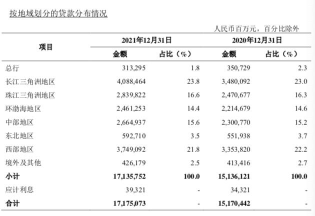 比如2021年农行长三角、珠三角贷款占比分别为23.8%、16.6%,相比上年分别增加0.8、0.3个百分点,东北地区、环渤海地区贷款占比均下降0.2个百分点。