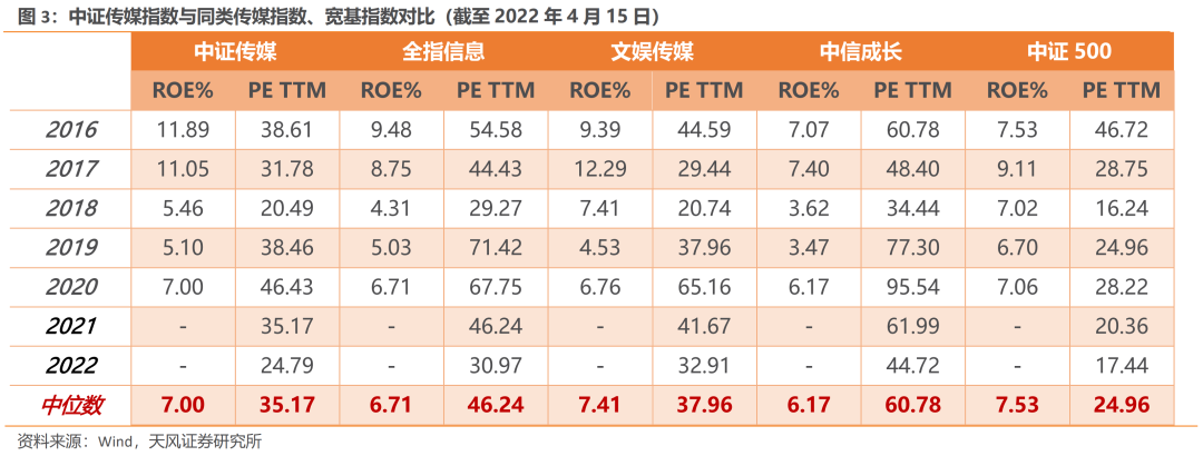 权重股方面,中证传媒指数聚焦传媒行业细分方向龙头,较强的龙头效应是其盈利能力优于同类指数的关键。在行业增速放缓、竞争加剧及监管趋严的背景下,抗风险能力较强的龙头公司业绩占优。中证传媒指数前十大权重股占比48.26%,且多为各细分方向龙头,其他同类指数龙头效应则相对较弱。以全指信息为例,其前十大权重行业占比仅23.87%,权重集中度明显低于中证传媒指数,同时全指信息历史ROE自2016年来低于中证传媒,再次印证了传媒行业中龙头效应对盈利能力的积极作用。