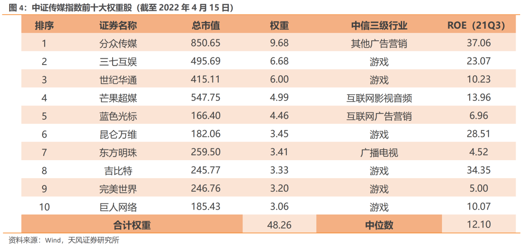 2. 横向看,中证传媒指数盈利能力优于同类传媒指数与成长风格指数,且较低的估值提供了一定安全边际。中证传媒指数盈利能力相对占优的背后是较强的龙头效应,前十大成分股权重合计占比达48.26%,显著高于同类传媒、TMT指数。龙头公司在行业政策变动、存量市场竞争中更易提高市占率,且抗风险能力更强,带来了更高的ROE水平。