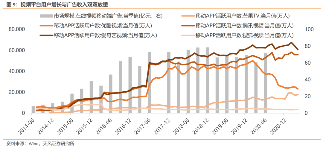 1)影视行业中,用户增长放缓、推送机制规范化等制约了传统广告收入增长,平台转型内容付费模式,当前付费用户稳定增长,会员收入增长稳定接棒;