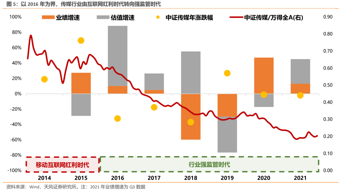 以2016年为界,传媒行业由互联网红利时代转向强监管时代,2021年起行业监管政策进一步扩散化。2016年前,受益于文化政策扶持与3G、4G移动互联网时代的到来,传媒行业规模与业绩快速发展。2016年以后,由于行业快速发展中部分从业者或作品出现偷税漏税、质量良莠不齐、影响青少年身心健康等乱象,决策层逐级加码行业监管,如2017年《网络游戏管理暂行办法》强化网游内容管理、《关于支持电视剧繁荣发展若干政策的通知》明确影视剧未经广电部门许可不得上网播放等。2021年,监管政策由游戏、影视领域扩散至平台经济,反垄断、《个保法》的出台等对传媒行业的估值与业绩造成进一步打压。