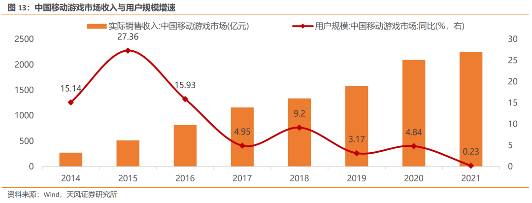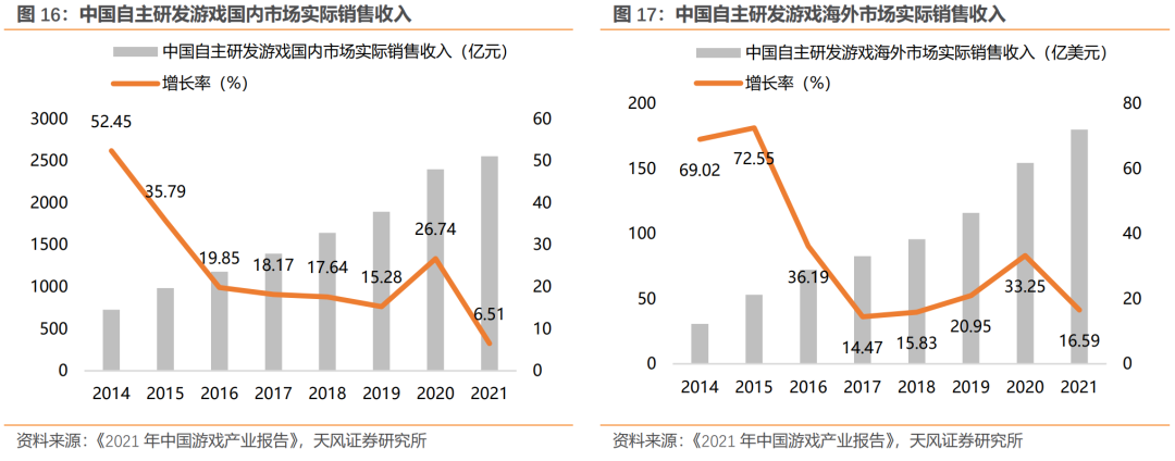 海外方面,中国移动端游戏竞争优势明显,海外收入仍处于高速增长阶段。根据《2021年中国游戏产业报告》,除2020年疫情爆发提振宅娱乐外,国产游戏国内市场收入增长率整体连续多年放缓至6.5%,国产游戏海外销售收入近5年增速整体上行,2021年有所回落,但仍保持两位数以上增幅。在国内政策扰动、增量空间有限的背景下,海外收入成为撬动游戏产业发展的另一大支点。