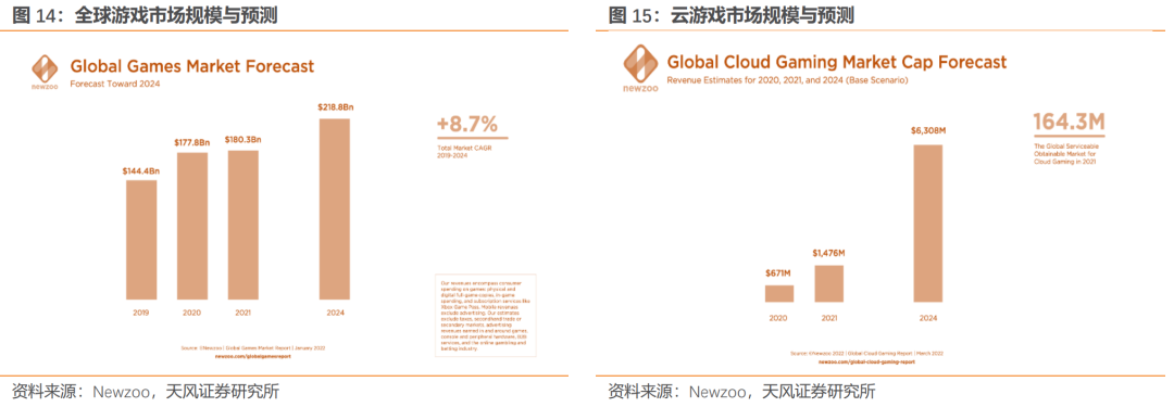 随着VR/AR设备渗透以及元宇宙概念在游戏领域加速落地,云游戏有望成为游戏领域增长主流。根据Newzoo测算,2019-2024年,全球游戏市场规模CAGR为8.7%,而全球云游戏市场规模有望在2024年达到63.08亿美元,折算2020-2024年CAGR为75.10%,增长空间显著高于传统游戏。