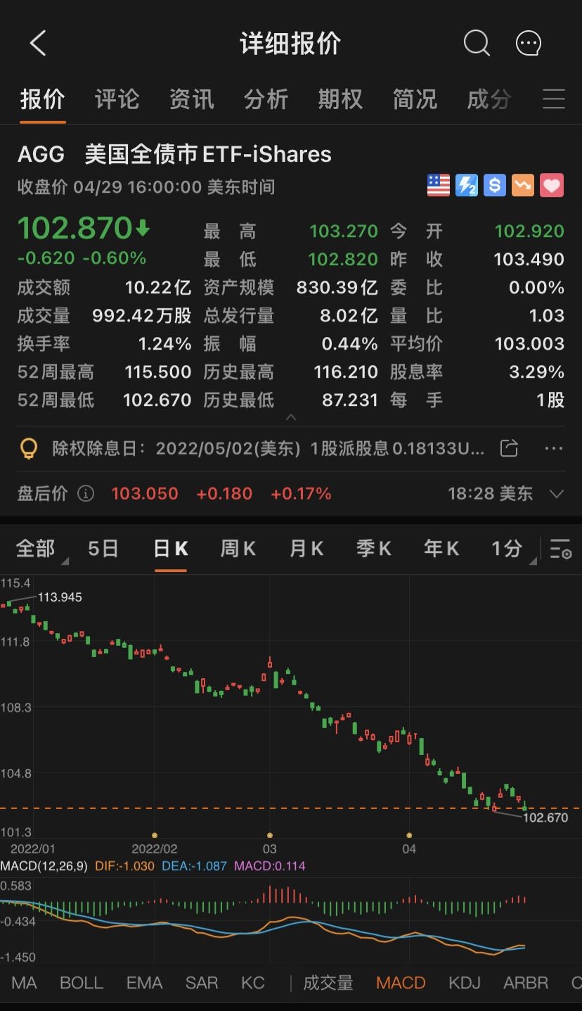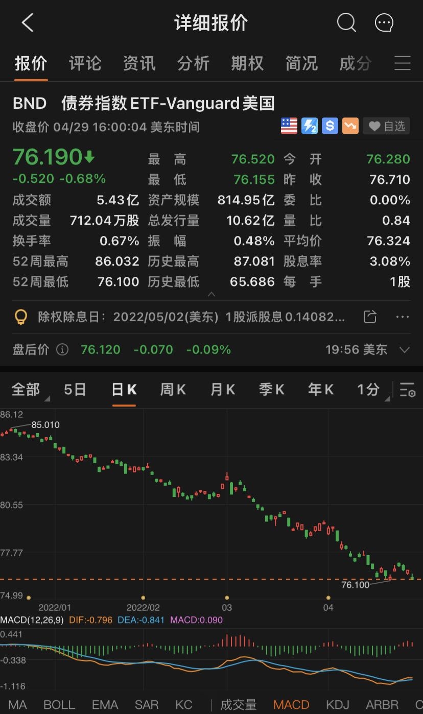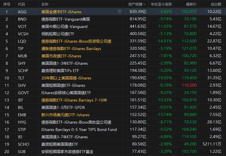 其次是,先锋全面债券市场ETF(代码:BND),总规模为814亿美元,今年前四个月跌幅达到9.74%。