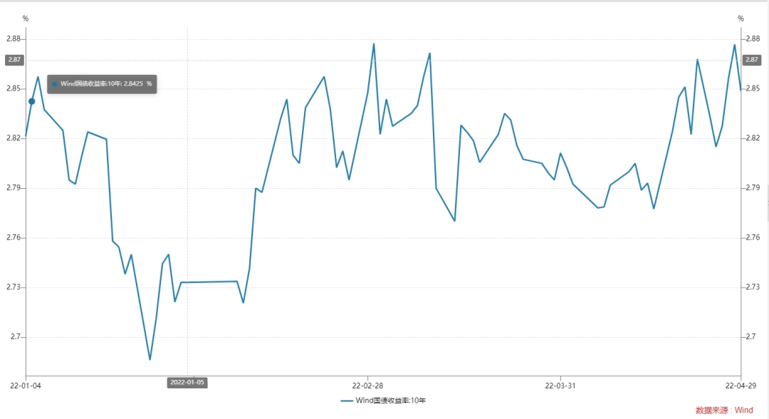 相比美国持续收紧金融环境,中国则在边际放松。相对于美国债券市场暴跌,国内债券市场利率基本保持平稳。根据Wind数据来看,10年期国债收益率,在今年年初时报价2.8214%,至4月底报价2.8488%,基本保持平稳。