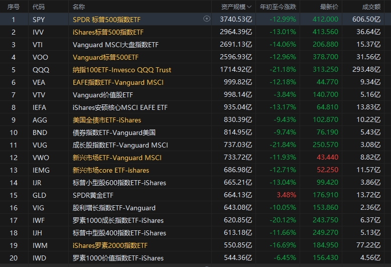 在美国权益ETF上,机构投资者持仓占比约为六成,相关ETF表现可以说代表了多数机构投资者的走势情况,平均跌幅在12%以上。下图为,按照资产规模排序的结果。