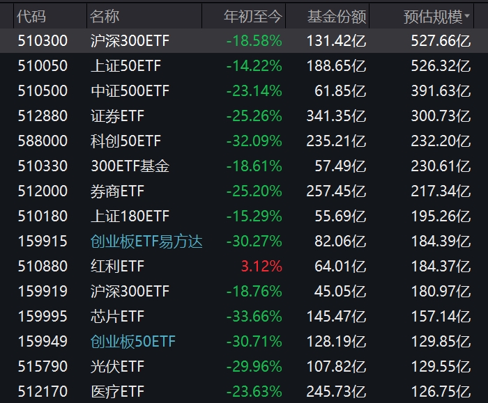 在中国权益市场上,ETF基金跌幅也不小。在按照预估规模排序统计来看,排在前面的沪深300ETF,今年前4个月,跌幅达到18.58%。